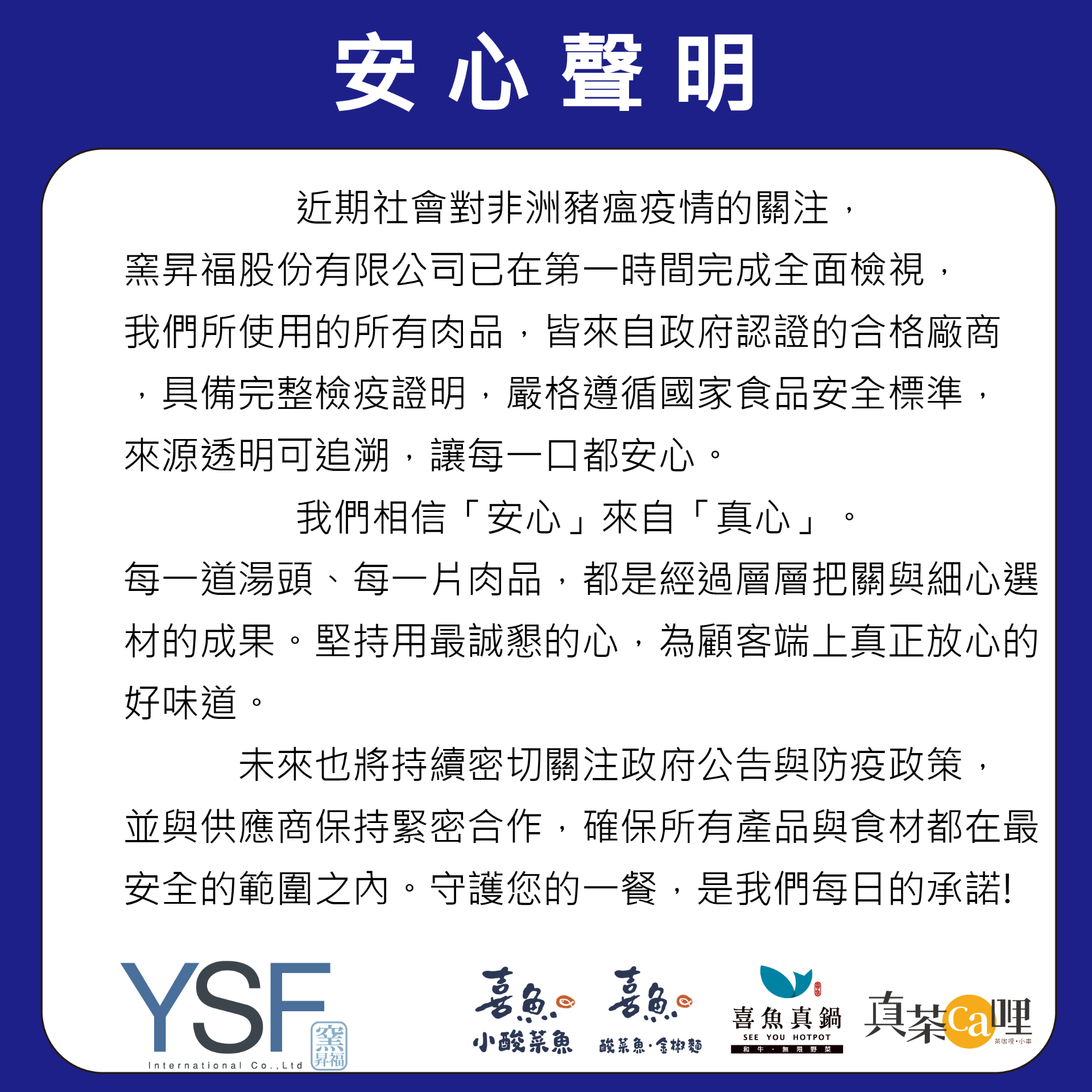 近期社會對非洲豬瘟疫情的關注,窯昇福股份有限公司已在第一時間完成全面檢視與確認。我們所使用的所有肉品,皆來自政府認證的合格廠商,具備完整檢疫證明,嚴格遵循國家食品安全標準,來源透明可追溯,讓每一口都安心。我們相信「安心」來自「真心」。每一道湯頭、每一片肉品,都是經過層層把關與細心選材的成果。堅持用最誠懇的心,為顧客端上真正放心的好味道。未來也將持續密切關注政府公告與防疫政策,並與供應商保持緊密合作,確保所有產品與食材都在最安全的範圍之內。守護您的一餐,是我們每日的承諾。
